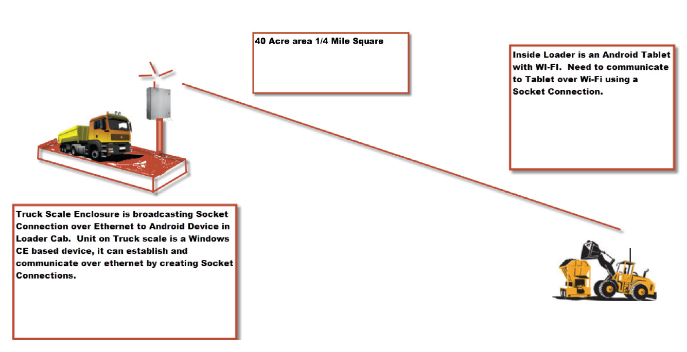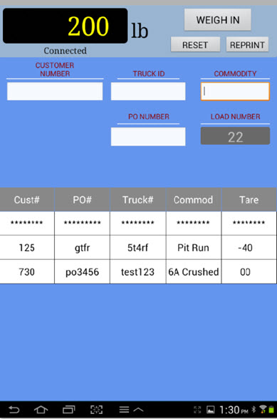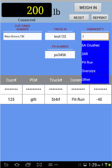 This application interfaced an Adroid Tablet with a Truck Scale Weighing System. The Android tablet was mounted in a front end loader. As the truck passed across the scale, the operator in the front end loader was able to weigh in and out the truck on the scale. The operator was able to quickly select entry data items such as Customer Number, Truck ID, etc... These were selected from dropdown boxes on the screen. The dropdown data was stored in tables on the tablet. When the weigh in and out transactions were completed, the completed transactions were stored to and Excel spreadsheet. A ticket was printed to the truck driver.